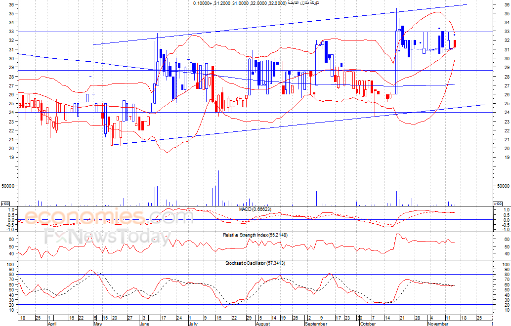 من المتوقع ان يكون النطاق السعري خلال جلسة اليوم بين مستوى الدعم هو 30.4 فلس وبين مستوى المقاومة هو 31.8 فلس