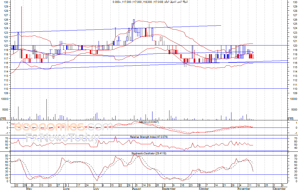من المتوقع ان يكون النطاق السعري خلال جلسة اليوم بين مستوى الدعم هو 116 فلس وبين مستوى المقاومة هو 118 فلس