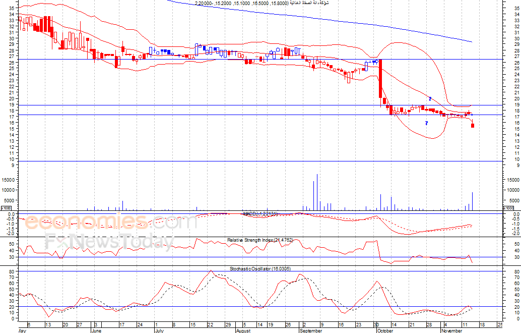 انخفض السهم بفجوة سعرية خلال تداولات الخميس الماضي لينهي الجلسة عند مستوى 15٫20 فلس، مسجلا بذلك ادنى مستوى يصل اليه السهم منذ بداية تداولاته، وفي ظل ارتفاع كمية التداول، مما نتوقع معه استمرار الانخفاض الحالي للوصول لمستوى الدعم 12٫50 فلس كمستوى اول ثم 10 فلس كمستوى ثان، شرط بقاء السهم اسفل مستوى 19 فلس.