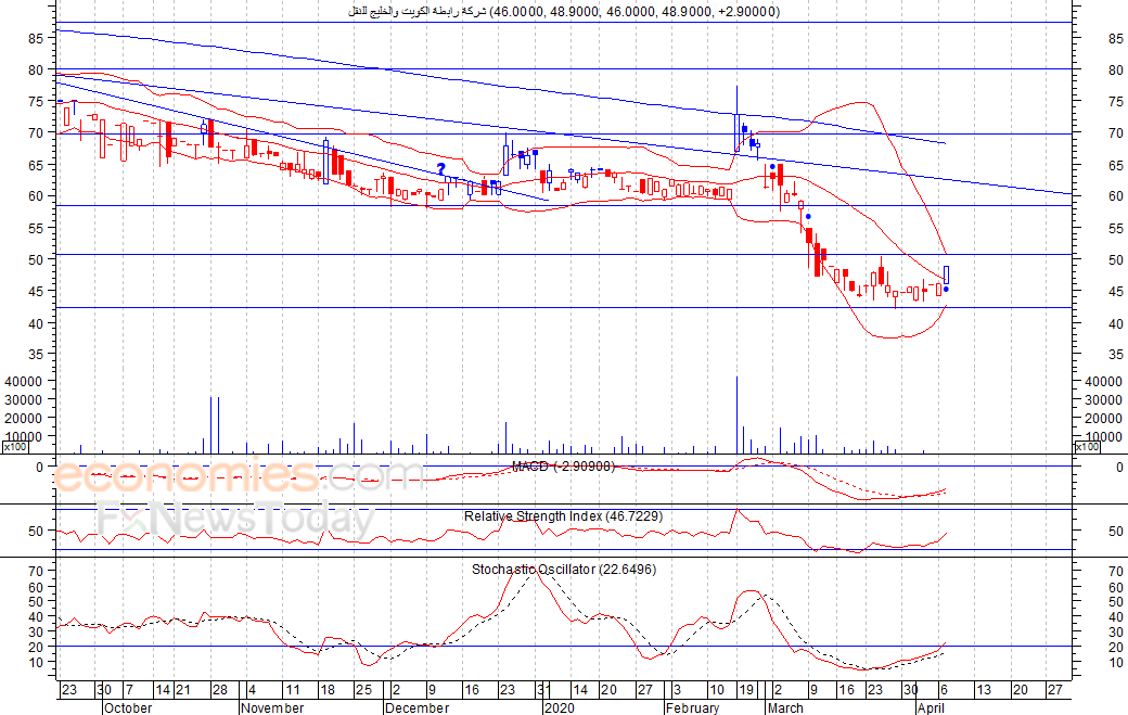 شهد السهم تحسن في الأداء في الأجل القصير خاصة جلسة امس الثلاثاء، حيث اغلق عند مستوى 49٫90 فلس، وهو أعلى مستوى يحققه السهم خلال الجلسة، ومصحوبا بانطلاق إشارة شراء على مؤشر استوكاستيك، مما يمهد الطريق أمام السهم لمزيد من الارتفاع لمستوى المقاومة 51 فلس كمستوى أول ثم 59 فلس كمستوى ثان، شرط بقاء السهم أعلى مستوى 42 فلس.