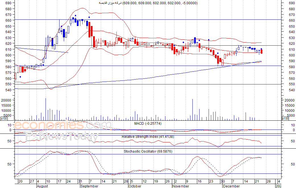 متوقع ان يكون النطاق السعري خلال اليوم الحالي بين مستوى الدعم هو 597 بينما مستوى المقاومة هو 605 فلس
