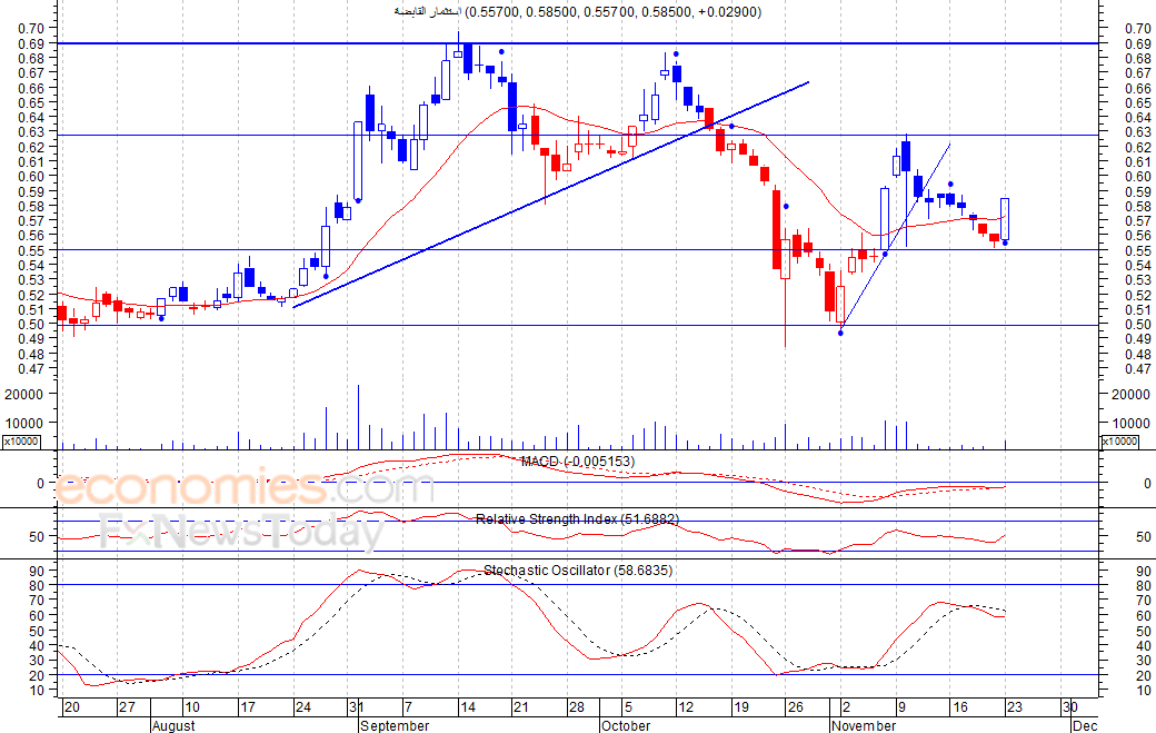 فقد السهم مكاسبه التي حققها خلال جلسة امس الاثنين، حيث سجل ارتفاع بلغ 626 فلس، الا انه تراجع ليغلق منخفضا عند مستوى 609 فلس، مصحوبا بارتفاع ضخم في كمية التداول، وهو ما قد يضغط على السهم لمستويات قد تصل الى 600 فلس كمستوى أول ثم 580 فلس كمستوى ثان، شرط بقاء السهم اسفل مستوى 630 فلس.