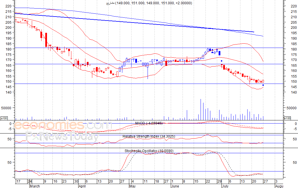 متوقع ان يكون النطاق السعري خلال اليوم الحالي بين مستوى الدعم هو 150 بينما مستوى المقاومة هو 153 فلس