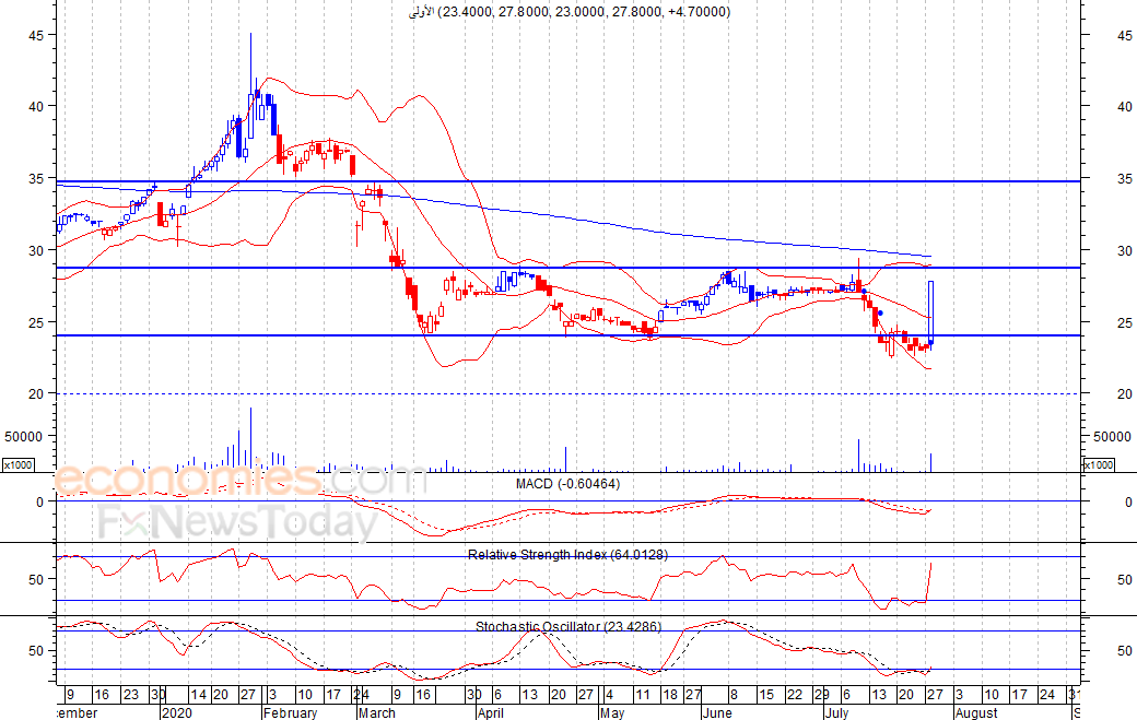 متوقع ان يكون النطاق السعري خلال اليوم الحالي بين مستوى الدعم هو 26 بينما مستوى المقاومة هو 30 فلس