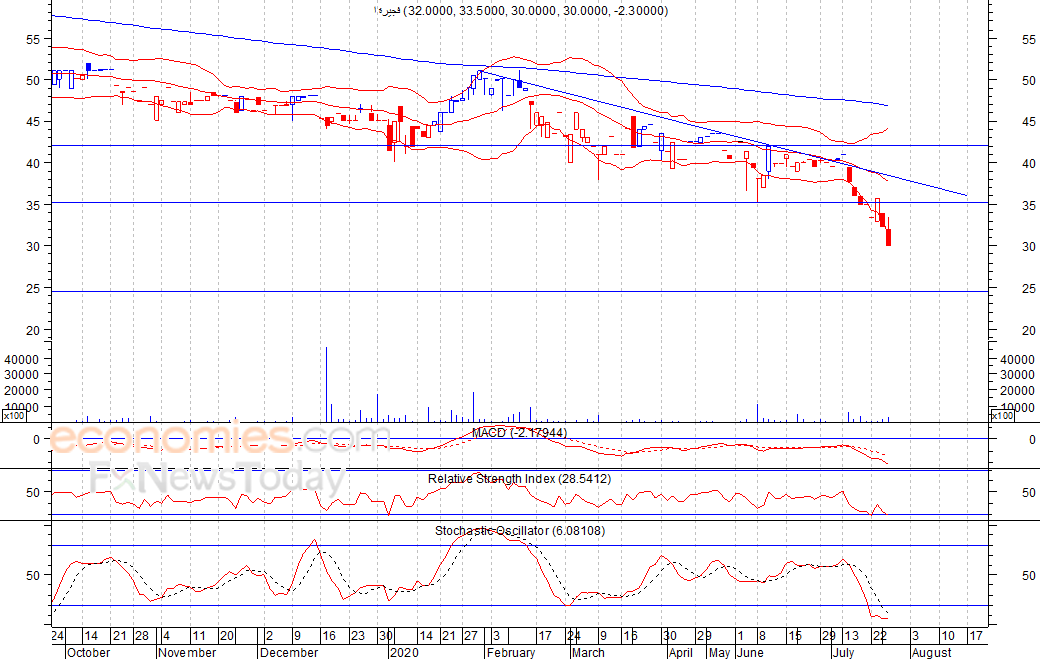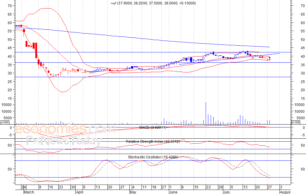 انخفض السهم ليغلق امس الثلاثاء عند مستوى 30 فلس، وهو أدني مستوى يحققه السهم منذ بداية تداوله، مستقرا بذلك اسفل الحد السفلي لمؤشر "bollinger Bands” وهو ما يفتح الباب أمام السهم لمزيد من الانخفاض لمستويات قد تصل الى 25 فلس كمستوى أول، شرط بقاء السهم اسفل مستوى 35 فلس.