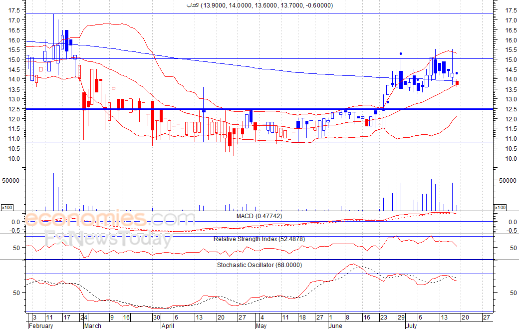 سيطرت القوى البيعية على تداولات السهم خلال تداولات امس الاحد، حيث اغلق عند مستوى 13٫70 فلس،وهو أدني مستوى في اسبوع، كما نلاحظ انطلاق إشارة بيع على مؤشر ماكد، لذلك فالأنظار تتجه لأسفل لمستوى الدعم 12٫50 فلس كمستوى اول، شرط عدم تجاوز السهم لمستوى 15 فلس.