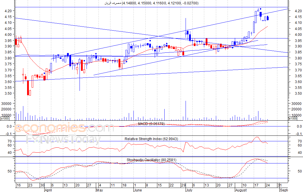 من المتوقع ان يكون النطاق السعري خلال جلسة اليوم بين مستوى الدعم هو 4.10 ريال وبين مستوى المقاومة هو 4.14 ريال