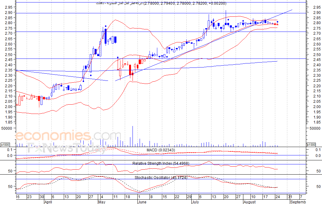 تحرك السهم لأعلى بشكل طفيف مقارنة بإغلاقه السابق، حيث اغلق امس الثلاثاء عند مستوى 2٫782 ريال، مخترقا بذلك متوسطه المتحرك لـ 20 يوم، مما نتوقع معه إمكانية انخفاض السهم في عملية جني أرباح في الأجل القصير للوصول لمستوى الدعم 2٫70 ريال، شرط بقاء السهم اسفل مستوى 2٫90 ريال.