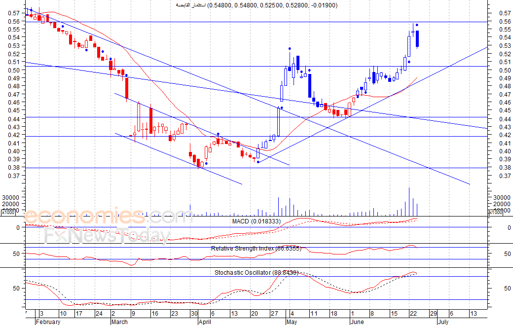 من المتوقع ان يكون النطاق السعري خلال جلسة اليوم بين مستوى الدعم هو 0.515 ريال وبين مستوى المقاومة هو 0.54 ريال