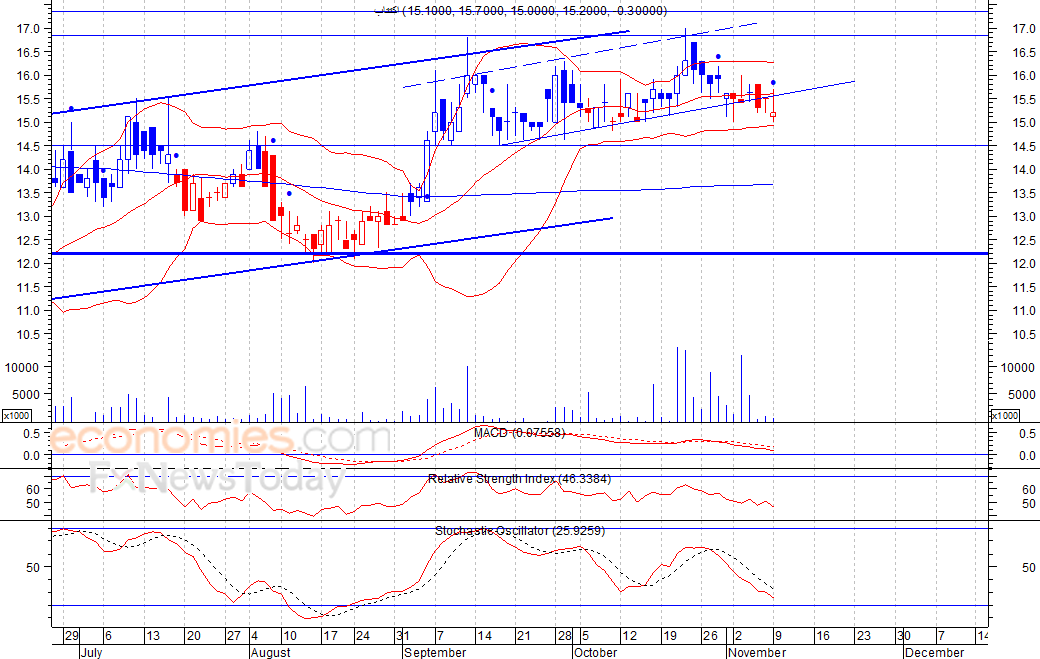 انخفض السهم كما اشرنا في تقريرنا الاخير، حيث اغلق عند مستوى 15٫20 فلس امس الاثنين، في ظل استمرار تدني كميات التداول، لينزلق بذلك اسفل القناة الصاعدة قصيرة الأجل، مما يجعل الأنظار تتجه لأسفل لمستوى الدعم 14٫50 فلس كمستوى أول ثم 13٫50 فلس كمستوى ثان، شرط بقاء السهم اسفل مستوى 16 فلس.