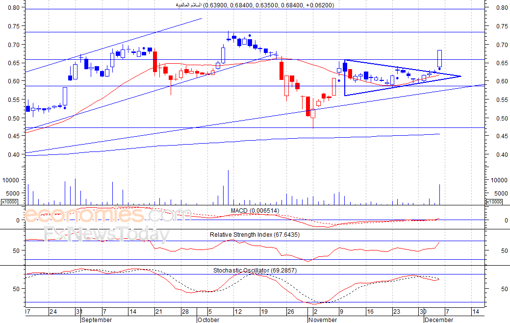 من المتوقع ان يكون النطاق السعري خلال جلسة اليوم بين مستوى الدعم وهو 0.67 وبين مستوى المقاومة هو 0.72 ريال