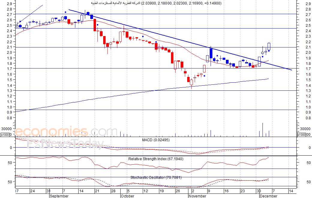 ارتفع السهم كما توقعنا في تقريرنا الاخير، حيث اغلق عند مستوى 2٫169 ريال، لينجح بذلك في تجاوز مستوى مقاومته السابق عند 2٫10 ريال، مما يفتح الباب أمام السهم لمزيد من الارتفاع في الأجل القصير لمستوى المقاومة التالي عند 2٫45 ريال كمستوى أول ثم 2٫70 ريال كمستوى ثان، شرط بقاء السهم أعلى مستوى 2 ريال.