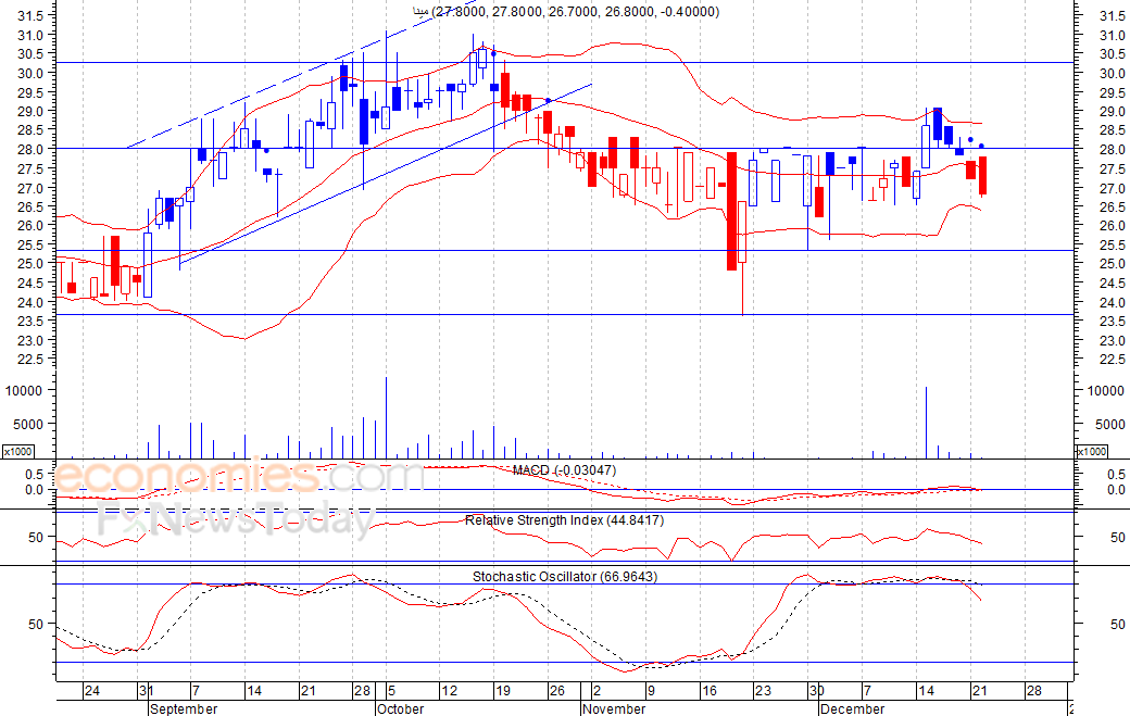 استهل السهم تداولات امس الثلاثاء مرتفعا عند مستوى 26٫80فلس، الا انه اغلق منخفضا عند مستوى 26٫80 فلس، مصحوبا بانطلاق إشارة بيع على مؤشر ماكد، لذلك نتوقع ان يشهد السهم عمليات جني أرباح قد تهبط به لمستوى الدعم 25٫30 فلس كمستوى أول ثم 23٫50 فلس كمستوى ثان، شرط بقاء السهم اسفل مستوى 28 فلس.