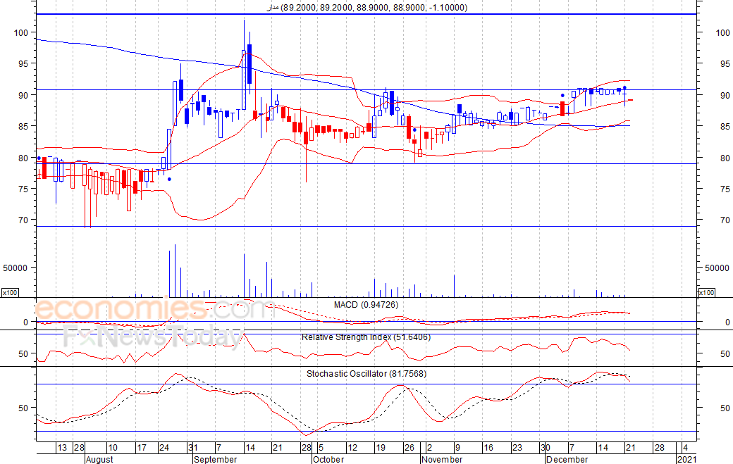 متوقع ان يكون النطاق السعري خلال اليوم الحالي بين مستوى الدعم هو 88 بينما مستوى المقاومة هو 89.1 فلس