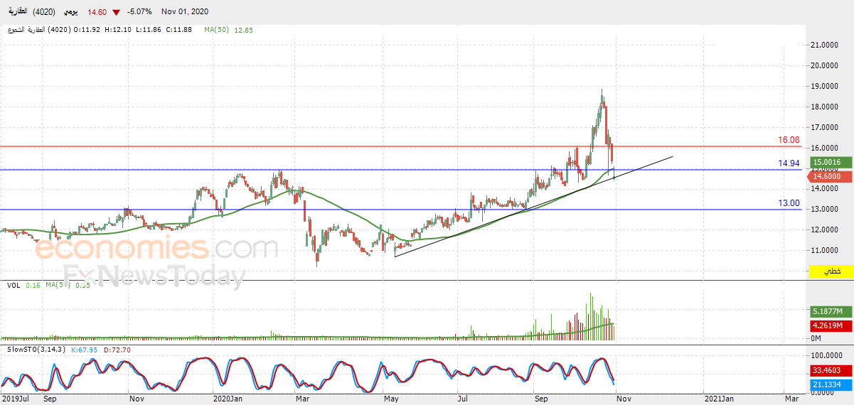 هبط سهم العقارية (4020) بتداولاته الأخيرة على المستويات اللحظية، وسط توارد الإشارات السلبية بمؤشرات القوة النسبية، ليسجل السهم خسائر في آخر جلساته بلغت نسبتها -5.07% بما يعادل -0.78 نقطة، ليتخطى السهم بهذا الانخفاض دعم متوسطه المتحرك البسيط لفترة 50 يوماً السابقة، وليستقر أدنى مستوى الدعم المحوري 14.94، ليستند في نهاية التداولات لدعم خط اتجاه صاعد على المدى القصير، كما هو موضح بالرسم البياني المرفق، ويعتبر هذا الدعم هو آخر محطاته التي يمكن أن تكسبه بعضاً من الزخم الإيجابي الذي قد يساعده على التعافي والارتفاع من جديد.