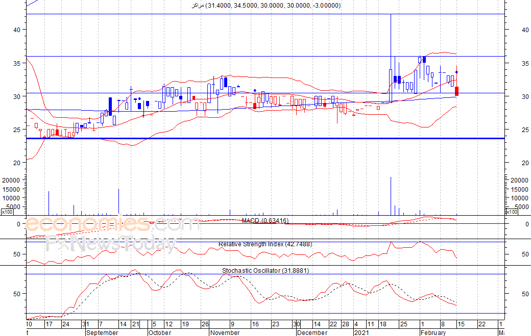 متوقع ان يكون النطاق السعري خلال اليوم الحالي بين مستوى الدعم هو 28.5 بينما مستوى المقاومة هو 32.0 فلس