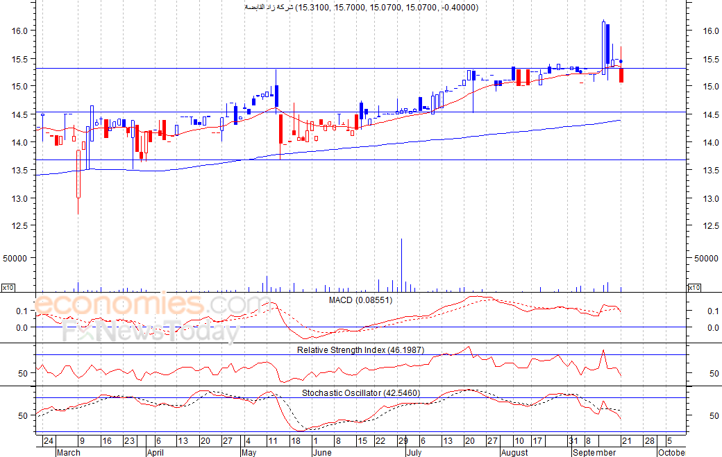 من المتوقع ان يكون النطاق السعري خلال جلسة اليوم بين مستوى الدعم هو 14.70 ريال وبين مستوى المقاومة هو 15.30 ريال
