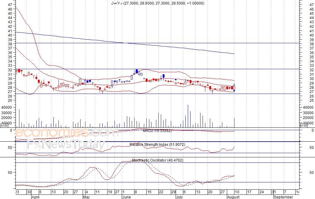 استهل السهم تداولات امس الاثنين منخفضا عند مستوى 28٫10 فلس،الا انه اغلق مرتفعا عند مستوى 29٫50 فلس، مصحوبا بارتفاع ضخم في كمية التداول، مما يعد إشارة ايجابية، كما اطلق مؤشر ماكد إشارة شراء، لذلك نتوقع ان يواصل السهم ارتفاعه لمستويات أعلى قد تصل الى 32 فلس كمستوى أول ثم 38 فلس كمستوى ثان، شرط بقاء السهم أعلى مستوى 27 فلس٫