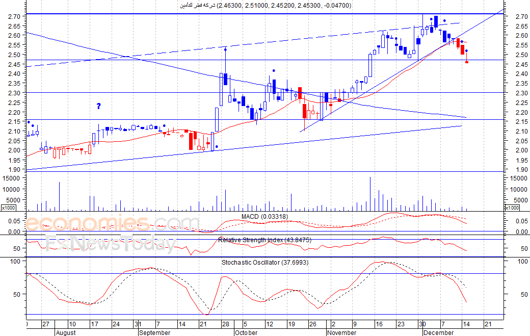 من المتوقع ان يكون النطاق السعري خلال جلسة اليوم بين مستوى الدعم هو 2.41 ريال وبين مستوى المقاومة هو 2.49 ريال
