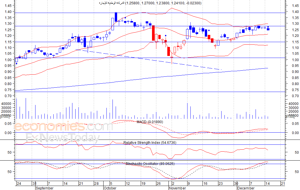 شهد السهم تراجعا خلال جلسة امس الثلاثاء ليغلق عند مستوى 1٫241 ريال، في ظل استمرار ملامسته لمستوى المقاومة الحالي والقوي عند 1٫28 ريال، كما نلاحظ استمرار تداول مؤشر استوكاستيك في منطقة الشراء المبالغ فيه، لذلك نتوقع ان يشهد السهم عمليات جني أرباح قد تهبط به لمستوى الدعم 1٫15 ريال كمستوى اول، شرط بقاء السهم اسفل مستوى 1٫30 ريال.