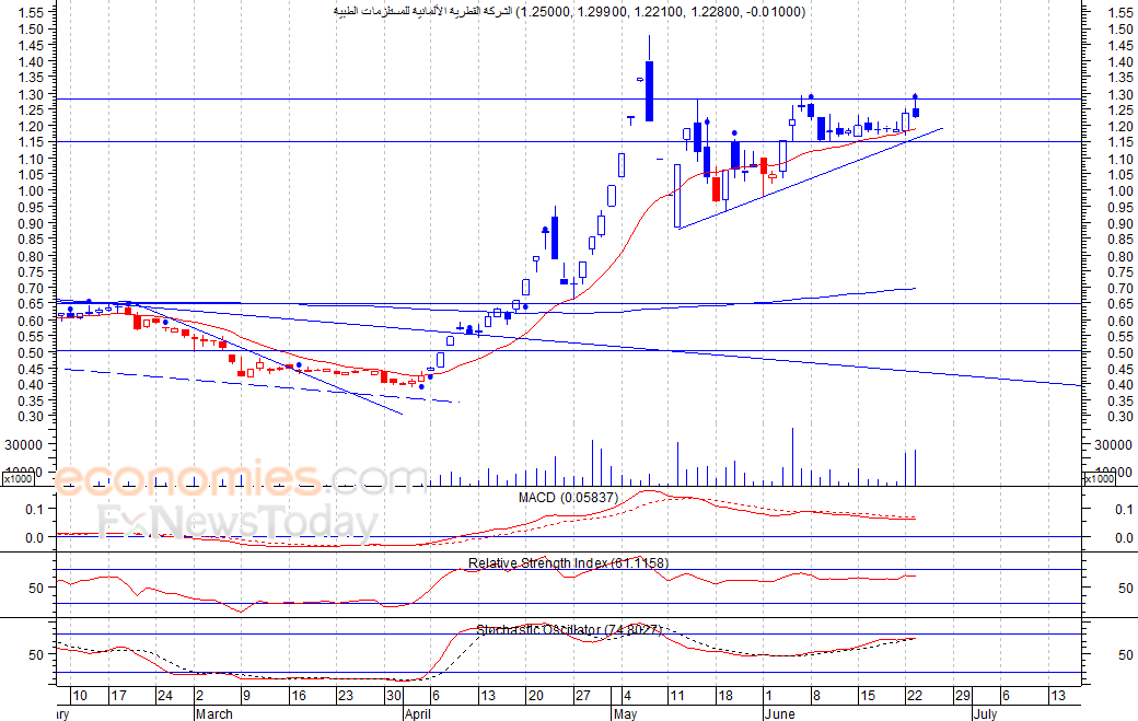 شهد السهم ارتفاعا خلال جلسة امس الثلاثاء ليغلق عند مستوى 6٫63 ريال، ليغلق بذلك في المنطقة الخضراء، مستقرا أعلى مستوى مقاومته السابق عند 6٫60 ريال، مما يمهد الطريق أمام السهم لمزيد من الارتفاع لمستوى المقاومة التالي عند 7 ريال، شرط بقاء السهم أعلى مستوى 6٫50 ريال.