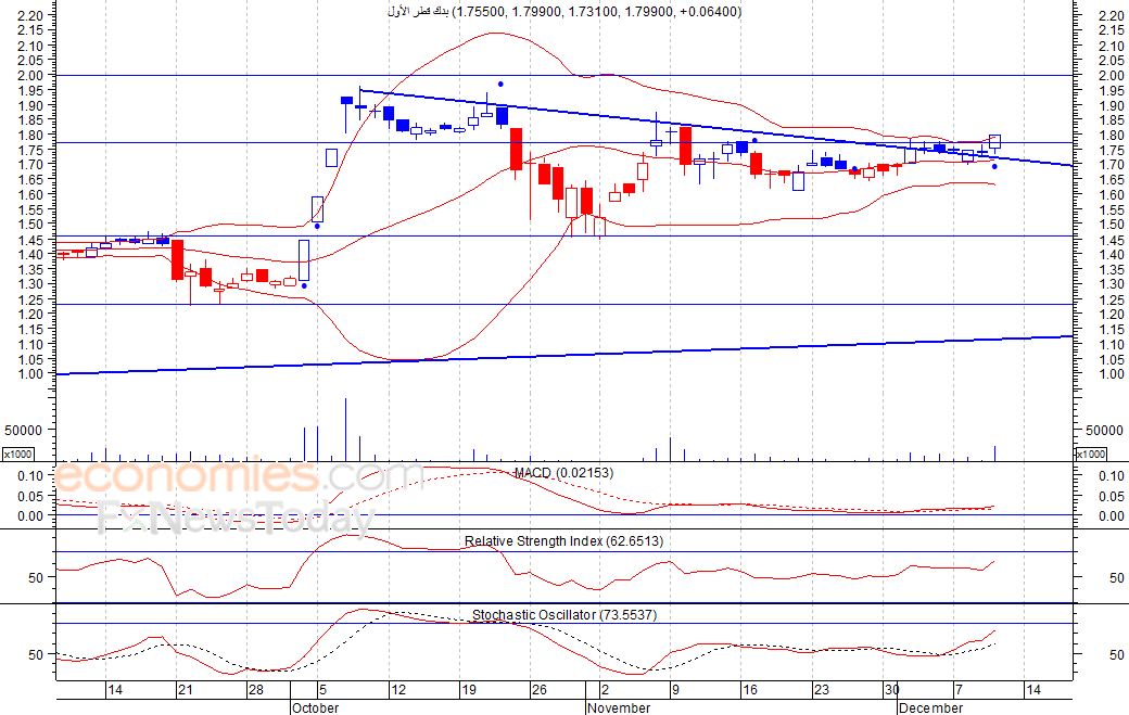 تمكن السهم من الارتفاع خلال اخر جلسات الأٍسبوع الماضي، حيث اغلق الخميس عند مستوى 1٫799 ريال، مصحوبا بارتفاع في كمية التداول، وهو ما يعد إشارة ايجابية، كما تمكن السهم من تجاوز خط الاتجاه الهابط قصير الأجل، مما يفتح الباب أمام السهم لمزيد من الارتفاع لمستوى المقاومة الهام عند 2 ريال، شرط ثبات السهم أعلى مستوى 1٫70 ريال.