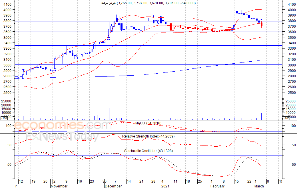 تحرك السهم لأسفل خلال تداولات الخميس الماضي، حيث اغلق عند مستوى 3701 فلس، مخترقا بذلك متوسطه المتحرك لـ 20 يوم، وهو ما يجعل الأنظار تتجه لأسفل لمستويات قد تصل الى 3600 فلس كمستوى أول ثم 3350 فلس كمستوى ثان، شرط بقاء السهم اسفل مستوى 3900 فلس.
