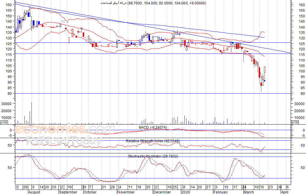 حلق السهم لأعلى في اخر جلسات الأسبوع الماضي، حيث اغلق عند مستوى 104 فلس، وهو أعلى مستوى يصل اليه السهم خلال الجلسة، مما يعد إشارة ايجابية، كما اطلق مؤشر القوة النسبية إشارة شراء، لذلك نتوقع ان يمدد السهم مكاسبه للوصول لمستوى المقاومة 115 فلس كمستوى أول ثم 125 فلس كمستوى ثان، شرط بقاء السهم أعلى مستوى 94 فلس٫