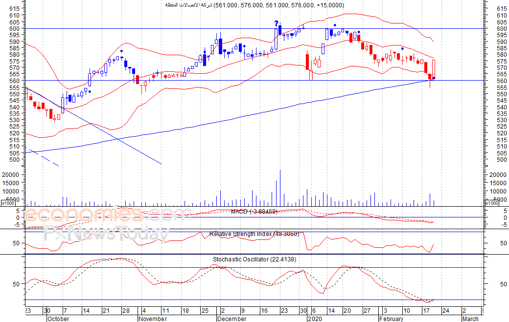عوض السهم خسائره التي حققها خلال الاسبوع الماضي، حيث اغلق الخميس مرتفعا عند مستوى 576 فلس، وذلك على خلفية ملامسته لمستوى الدعم الحالي عند 560 فلس، حيث يلامس متوسطه المتحرك لـ 200 يوم، والذي نتوقع ان يدفع بالسهم لأعلى لمستوى المقاومة 600 فلس،شرط عدم اختراق السهم لمستوى 560 فلس.