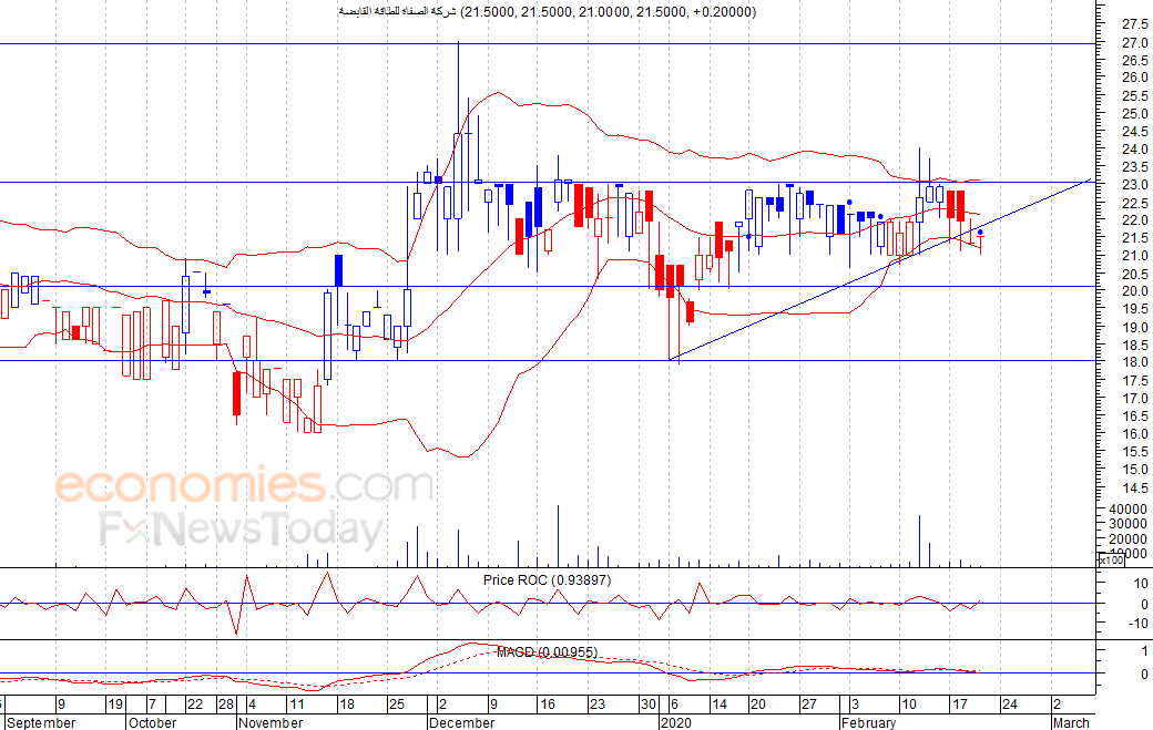ارتفع السهم لينهي تداولات اخر جلسات الأسبوع الماضي عند 21٫50 فلس، وهو نفس سعر الفتح للجلسة، كما اخترق السهم خط الاتجاه الصاعد قصير الأجل، مما يعد إشارة سلبية قد ترسل السهم لأسفل لمستوى الدعم 20 فلس كمستوى أول ثم 18 فلس كمستوى ثان، شرط بقاء السهم اسفل مستوى 23 فلس.
