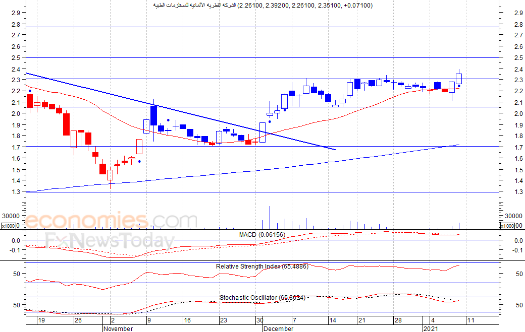 استعاد السهم اتجاهه الصاعد على المدى القصير، حيث اغلق امس الأحد مرتفعا عند مستوى 2٫351 ريال، متجاوزا بذلك مستوى مقاومته السابق عند 2٫30 ريال، كما يلامس السهم متوسطه المتحرك لـ 20 يوم، والذي نتوقع ان يساهم في دفع السهم لأعلى لمستوى المقاومة التالي عند 2٫50 ثم 2٫8 ريال كمستوى ثان، شرط بقاء السهم أعلى مستوى 2٫25 ريال.