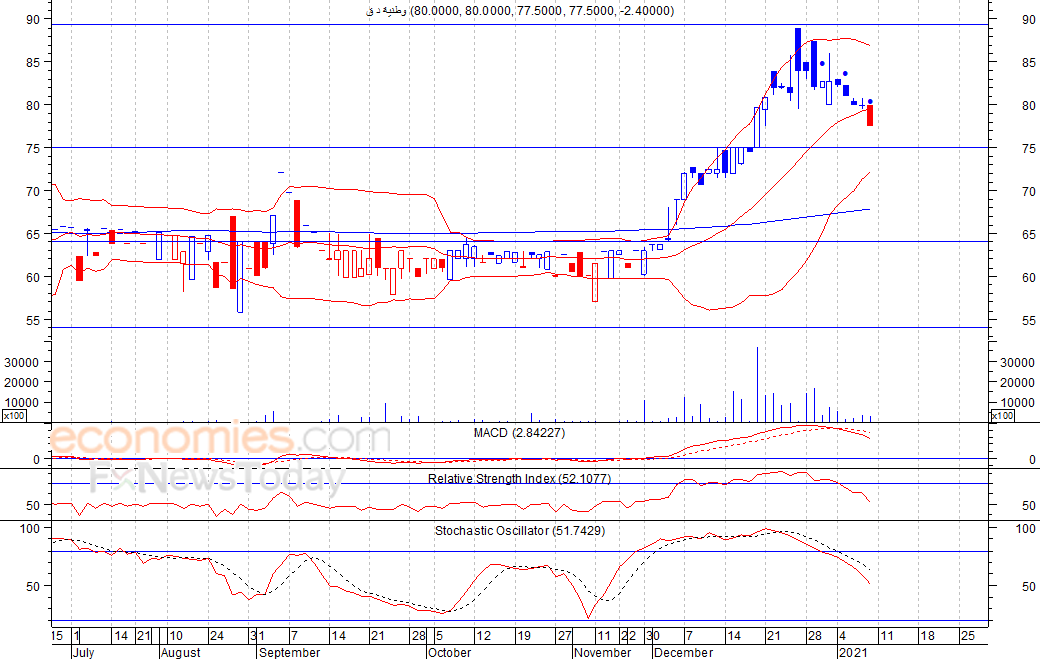متوقع ان يكون النطاق السعري خلال اليوم الحالي بين مستوى الدعم هو 76.7 بينما مستوى المقاومة هو 79.2 فلس
