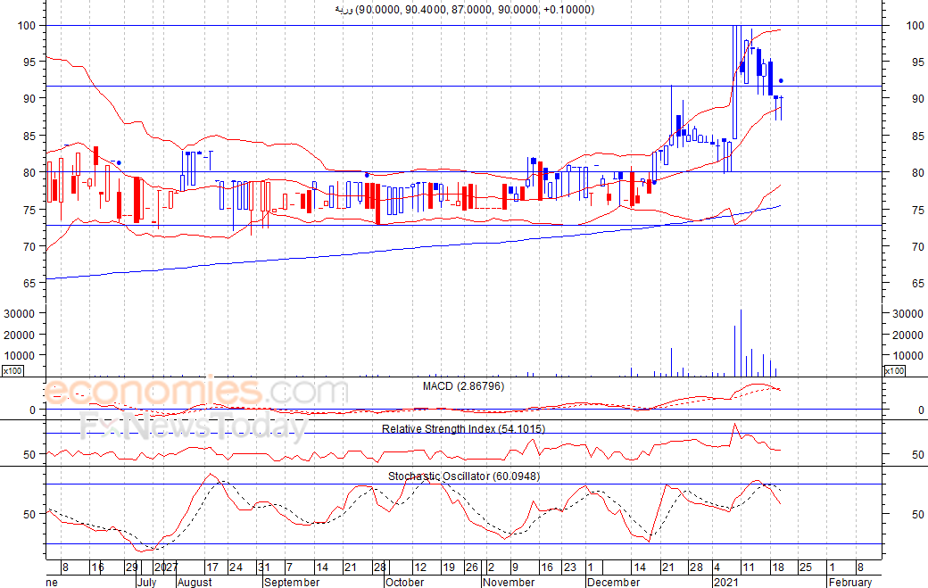 متوقع ان يكون النطاق السعري خلال اليوم الحالي بين مستوى الدعم هو 87.9 بينما مستوى المقاومة هو 91.3 فلس