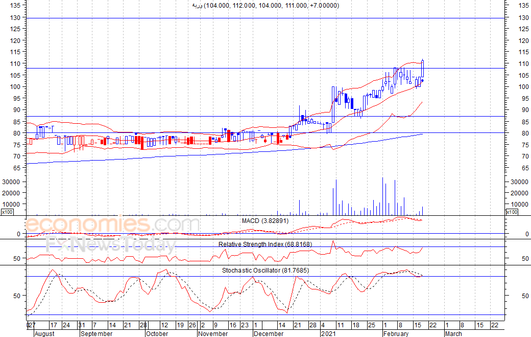 نجح السهم في الارتفاع وبقوة خلال تداولات الخميس الماضي، حيث اغلق عند مستوى 111 فلس، وهو أعلى مستوى يصل اليه السهم منذ شهر فبراير من عام 2016، كما تجاوز السهم مستوى مقاومته السابق عند 107 فلس، لذلك نتوقع ان يواصل السهم ارتفاعه لمستويات أعلى قد تصل الى 130 فلس، شرط بقاء السهم أعلى مستوى 105 فلس.