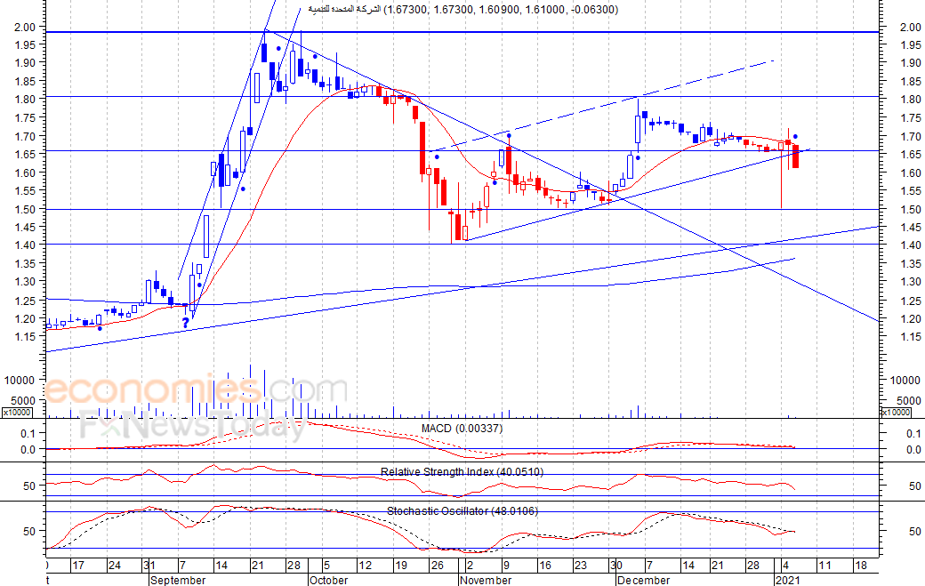 شهد السهم تراجعا كبيرا خلال جلسة امس الاربعاء، حيث اغلق عند مستوى 1٫61 ريال، مخترقا مستوى الدعم السابق عند 1٫66 ريال، كما اخترق السهم القناة الصاعدة قصيرة الأجل، لذلك نتوقع استمرار الانخفاض الحالي لمستوى الدعم التالي عند 1٫50 ثم 1٫40 ريال، شرط بقاء السهم اسفل مستوى 1٫70 ريال.