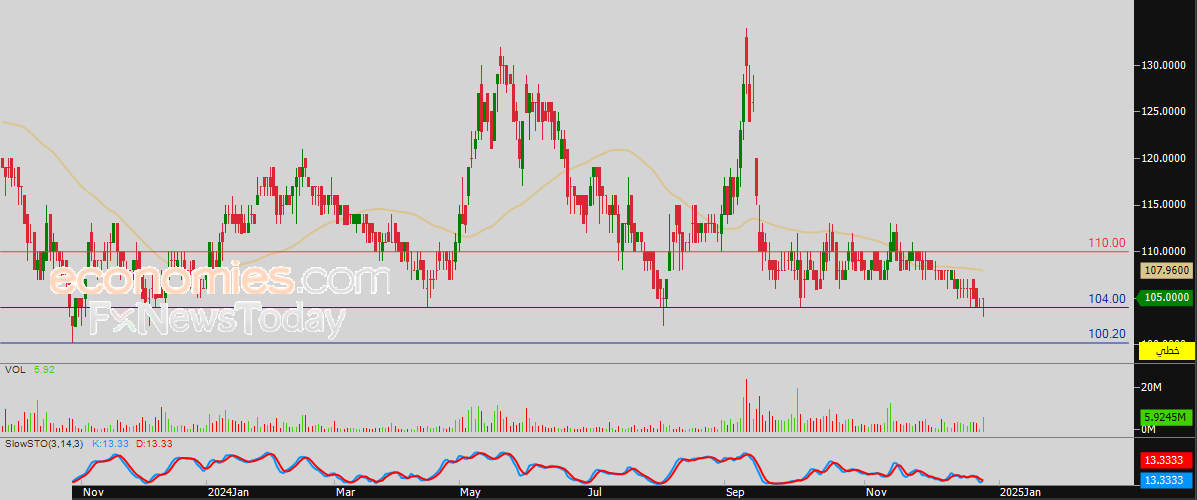 لذلك نحن نرجح عودة انخفاض سعر السهم خلال تداولاته القادمة، خاصة في حالة كسره لمستوى الدعم السابق ذكره 104.00، ليستهدف بعدها مستوى الدعم المحوري 100.20.