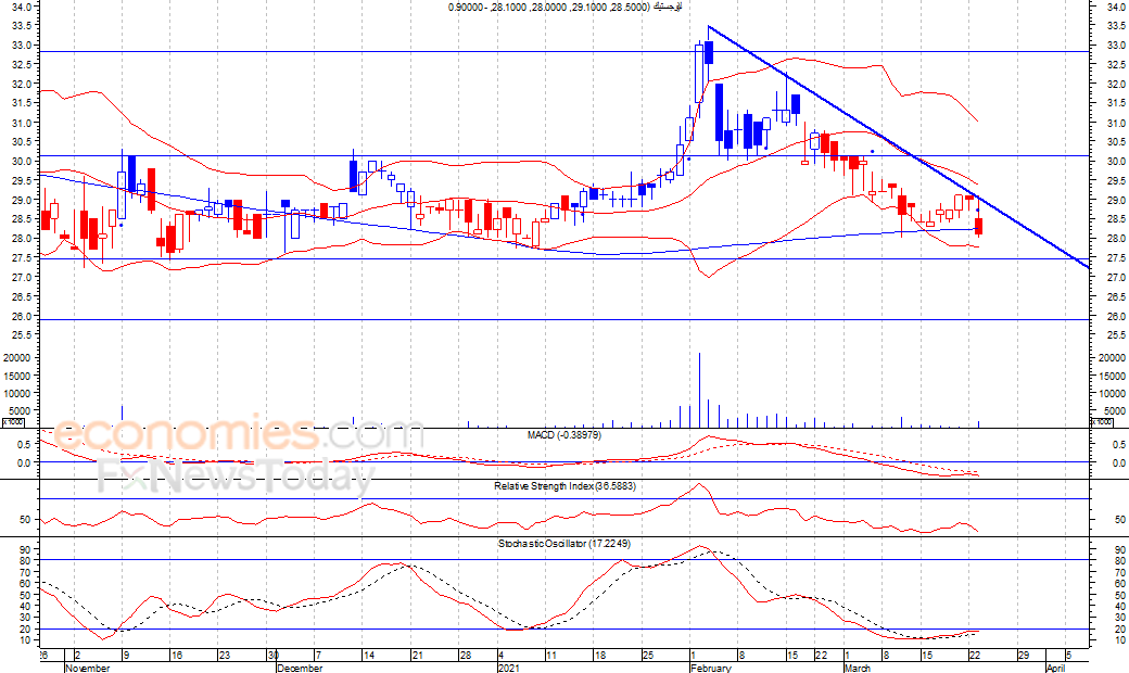 ومن المتوقع ان يكون النطاق السعري خلال جلسة اليوم بين مستوى الدعم هو 27.3 فلس وبين مستوى المقاومة هو 28.8 فلس