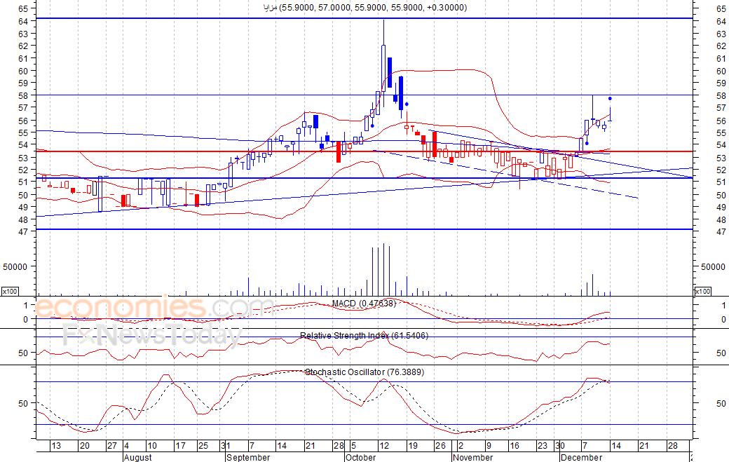 ارتفع السهم لهدفه السعري المتوقع عند مستوى 58 فلس، حيث اغلق امس الاثنين عند مستوى 55٫90 فلس، ملامسا للحد العلوي لمؤشر "Bollinger Bands” والذي نتوقع ان يساهم في دفع السهم لأسفل للوصول لمستوى الدعم 53٫50 فلس كمستوى أول ثم 51فلس كمستوى ثان، شرط بقاء السهم اسفل مستوى 58 فلس.