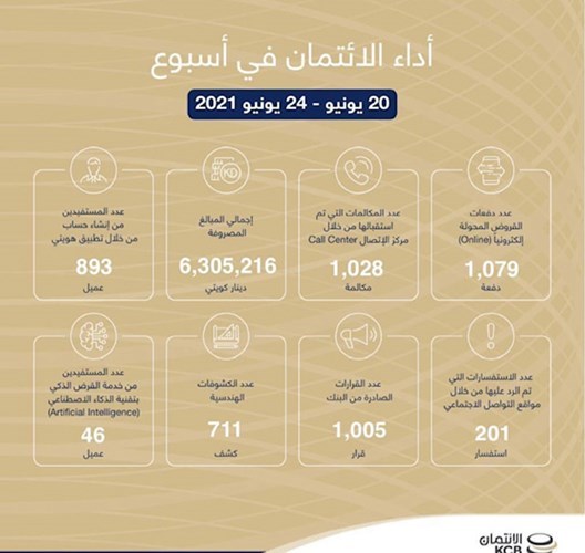 كشف بنك الائتمان الكويتي أن إجمالي مصروفاته خلال الأسبوع الماضي بلغ 6 ملايين و305 آلاف و216 دينارا، بينما تم تحويل قروض بواقع ألف و79 دفعة عبر "الأونلاين".