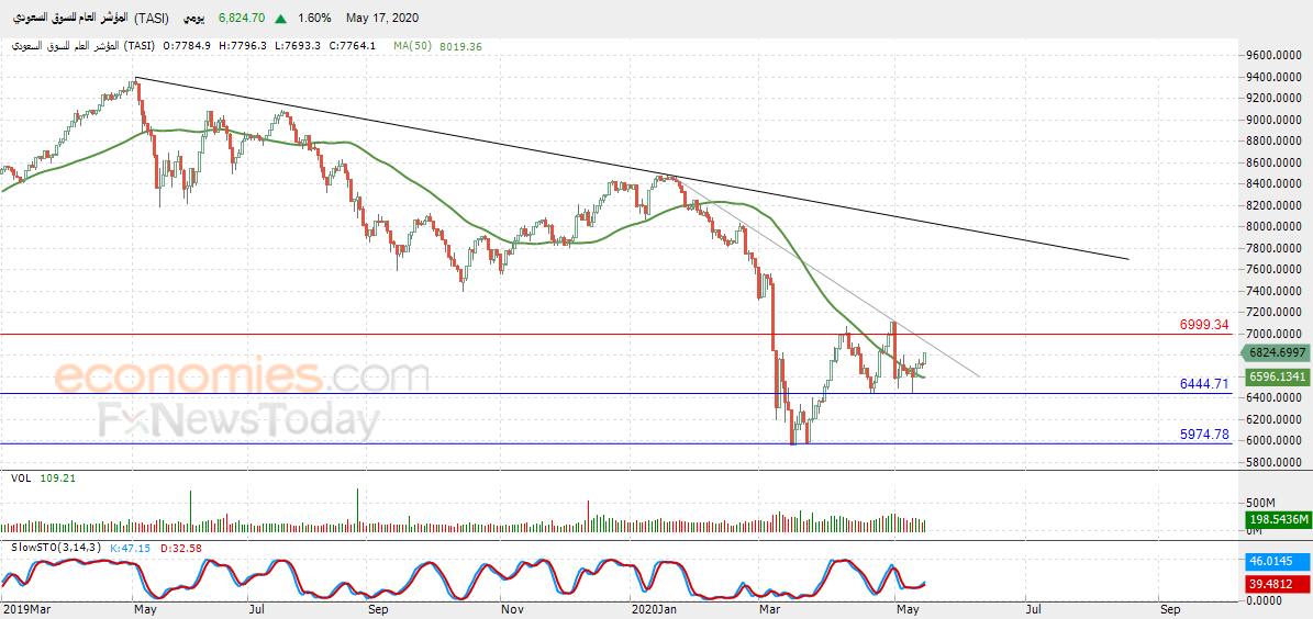 صعد المؤشر العام للسوق السعودي (TASI) بتداولاته الأخيرة على المستويات اللحظية، مستفيداً من الدعم الإيجابي للمتوسط المتحرك البسيط لفترة 50 يوماً السابقة، كما نلاحظ بدء ظهور تقاطع إيجابي بمؤشرات القوة النسبية، ليحقق مكاسب في آخر جلساته بنسبة بلغت 1.60% بما يعادل 107.72 نقطة، وذلك في ظل تداولات المؤشر بمحاذاة خط ميل رئيسي هابط على المدى المتوسط كما هو موضح بالرسم البياني المرفق.