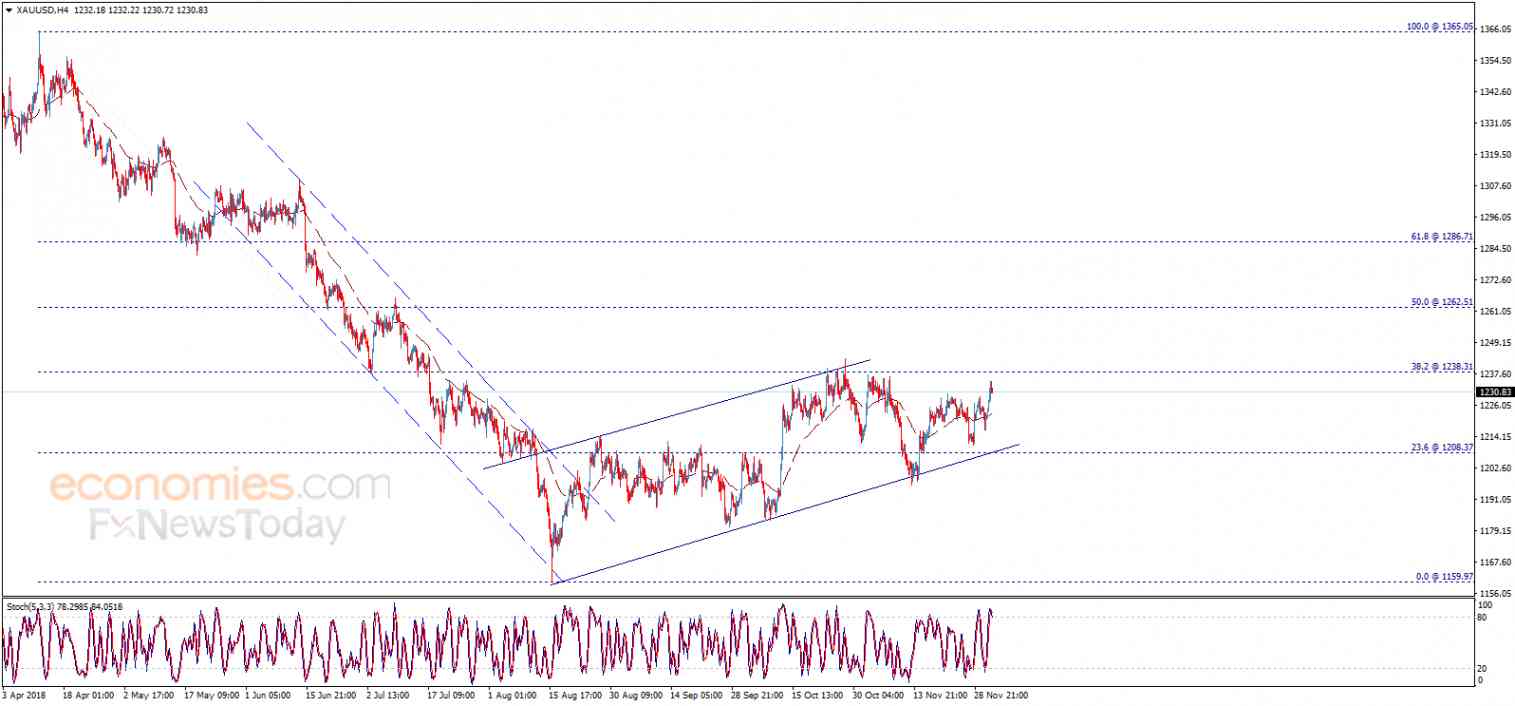 استمر سعر الذهب بالارتفاع ليقترب من مستوى 1238.30، وقد يضطر لبعض الانخفاض المؤقت بتأثير سلبية مؤشر ستوكاستيك قبل استئناف الاتجاه الصاعد المتوقع للفترة القادمة، مع التذكير بأن تجاوز الهدف المذكور سيدفع السعر نحو 1262.51 كهدف رئيسي تالي، بينما يحتاج السعر للثبات فوق 1208.40 لمواصلة الميل الصاعد المقترح.