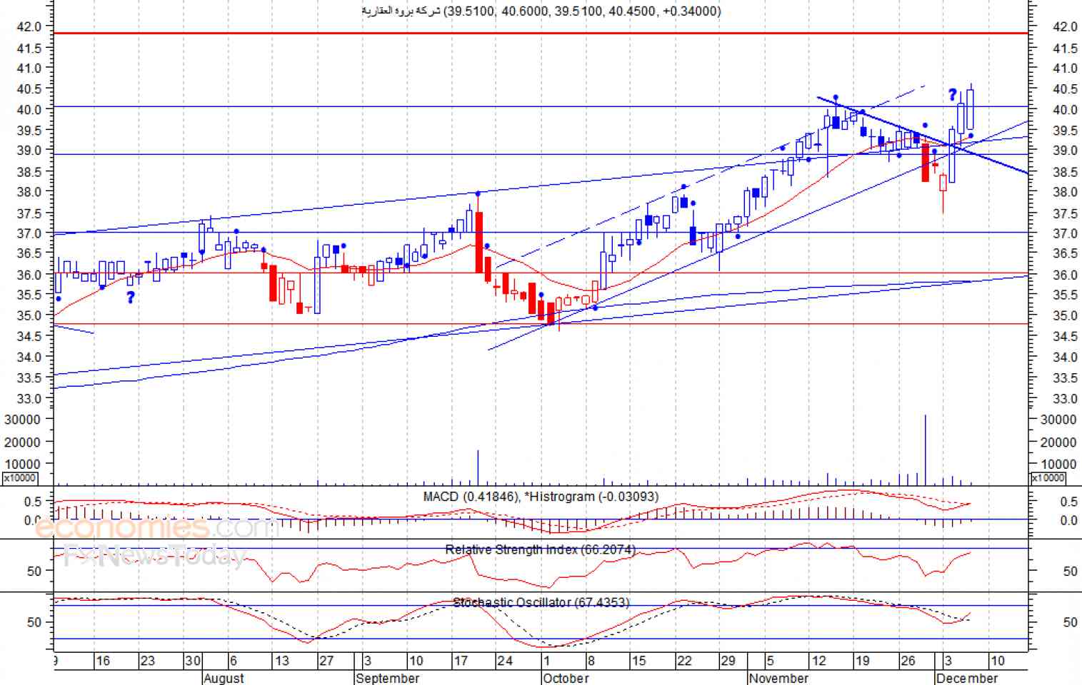 ومن المتوقع ان يكون النطاق السعري خلال جلسة اليوم بين مستوى الدعم وهو 39.77 وبين مستوى المقاومة هو 41.28 ريال