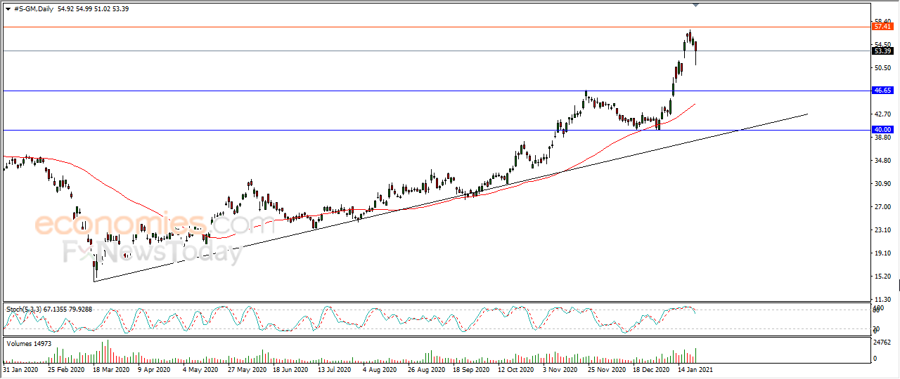 لذلك نحن نرجح عودة ارتفاع السهم خلال تداولاته القادمة، طيلة ثبات الدعم 46.65، ليستهدف مستوى المقاومة 57.40.