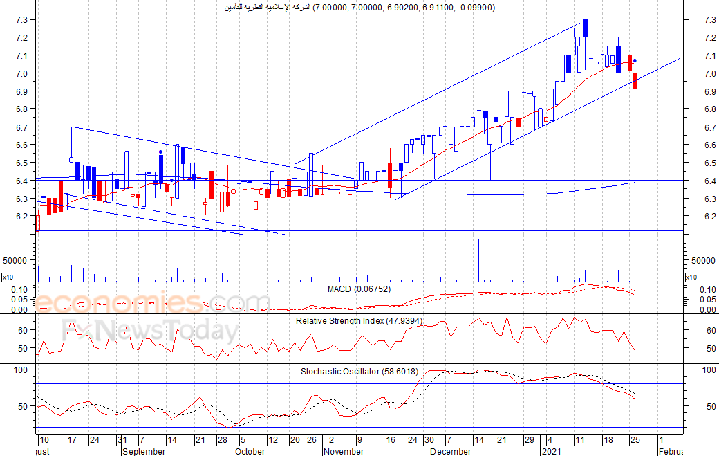 انخفض السهم خلال تداولات امس الثلاثاء ليغلق عند مستوى 6.911 ريال، مخترقا بذلك القناة الصاعدة قصيرة الأجل، وهو ما يعكس حالة التشاؤم لدى المتداولين، لذلك نتوقع انخفاضا في الأجل القصير لمستويات قد تصل الى 6.80 ريال كمستوى أول ثم 6.40 ريال كمستوى ثان، شرط بقاء السهم اسفل مستوى 7.10 ريال.