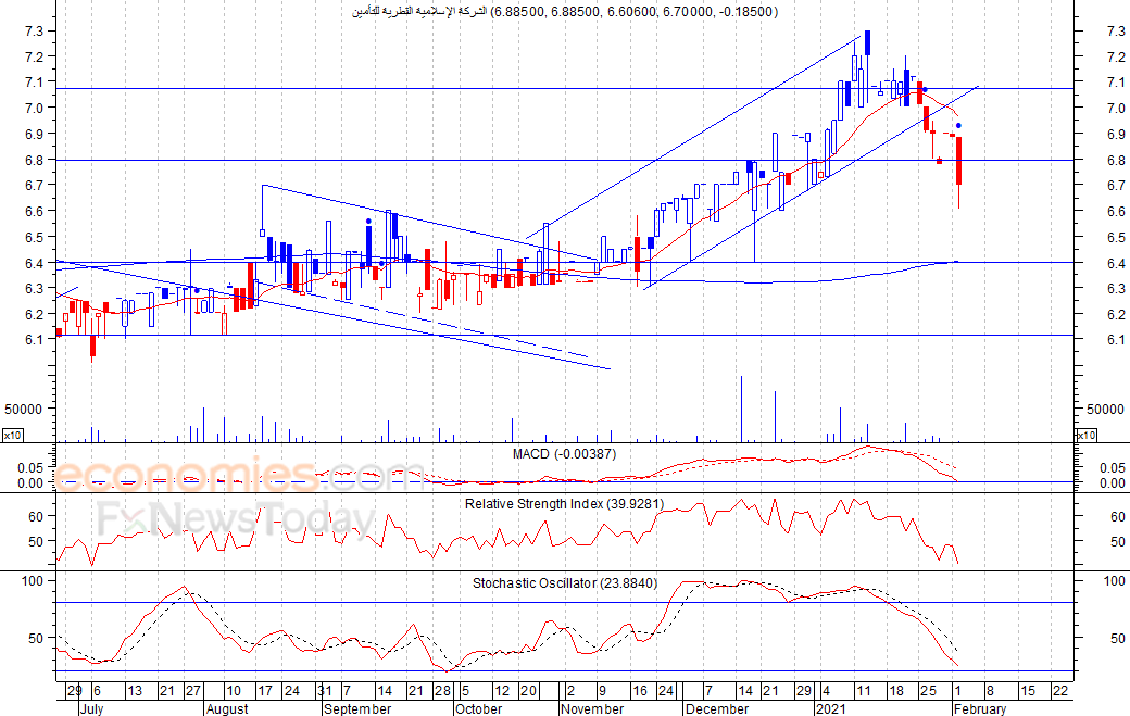 شهد السهم تراجعا خلال جلسة امس الثلاثاء ليغلق عند مستوى 6.70 ريال، مخترقا بذلك مستوى الدعم السابق عند 6.80 ريال، وهو ما يفتح الباب أمام السهم لمزيد من الانخفاض لمستوى الدعم التالي عند 6.40 ريال خلال الأيام والاسابيع القادمة للوصول لمستوى الدعم التالي، شرط بقاء السهم اسفل مستوى 6.80 ريال.