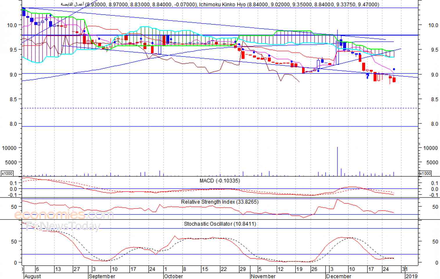 انخفض السهم في اخر جلسات الأسبوع لينهي تداولات الخميس عند مستوى 8.84ريال، مخترقا بذلك مستوى الدعم السابق عند 9 درهم، وهو المستوى الذي أشرنا اليه في تقريرنا الأخير، مما يعكس تنامي القوى البيعية، كما انزلق السهم أسفل القناة الهابطة متوسطة الأجل، مما ولد هدفا سعريا عند مستوى 8.30 ريال، وهو المستوى الذي يتجه اليه السهم حاليا، شرط عدم تجاوز السهم لمستوى 9.10 ريال.