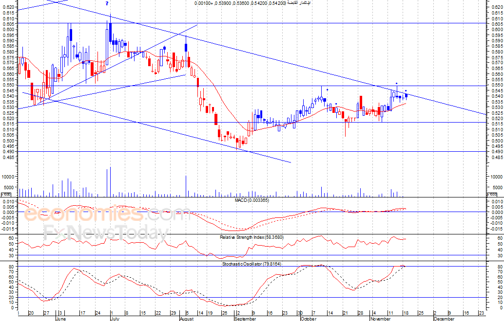من المتوقع ان يكون النطاق السعري خلال جلسة اليوم بين مستوى الدعم هو 0.53 ريال وبين مستوى المقاومة هو 0.54 ريال