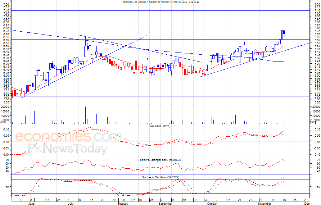 من المتوقع ان يكون النطاق السعري خلال جلسة اليوم بين مستوى الدعم هو 6.65 ريال وبين مستوى المقاومة هو 6.8 ريال