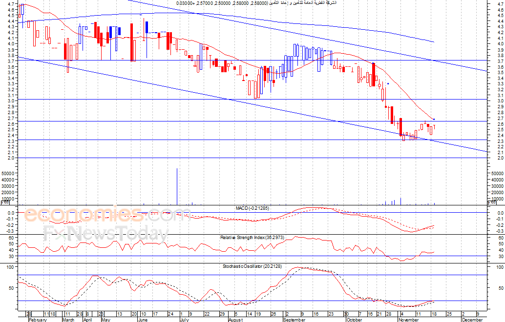 تمكن السهم من الارتفاع مرة اخرى لينهي تداولات امس الثلاثاء، حيث أغلق عند مستوى 2٫57 ريال، مقتربا بذلك من مستوى المقاومة القوي عند 2٫65 ريال، حيث يواجه السهم متوسطه المتحرك لـ 20 يوم، الذي نتوقع ان يضغط على السهم لأسفل مرة اخرى للوصول لمستوى الدعم 2٫30 ريال، شرط بقاء السهم اسفل مستوى 2٫70 ريال.