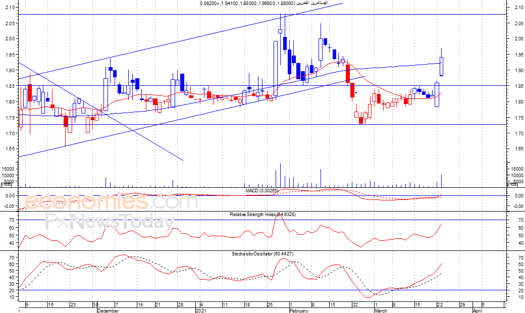 ومن المتوقع ان يكون النطاق السعري خلال جلسة اليوم بين مستوى الدعم هو 1.80 ريال وبين مستوى المقاومة هو 2 ريال